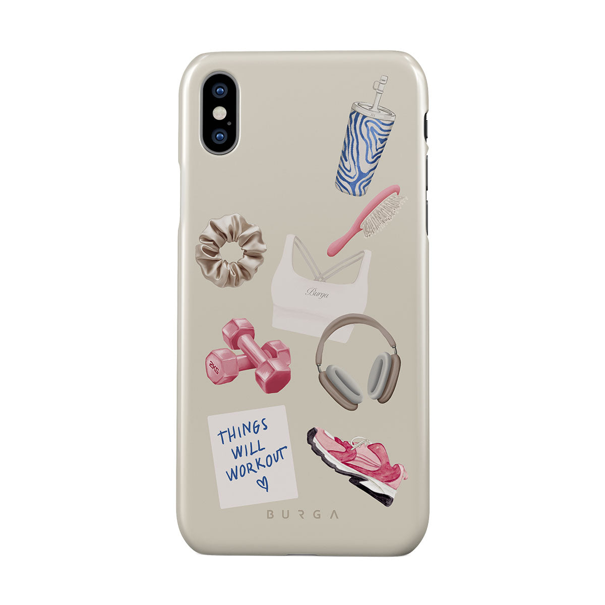 This design features: dumbbells, headphones, tumbler, hairbrush, pink trainers, sports bra, crunchie, "Things Will Work Out" sticky note
