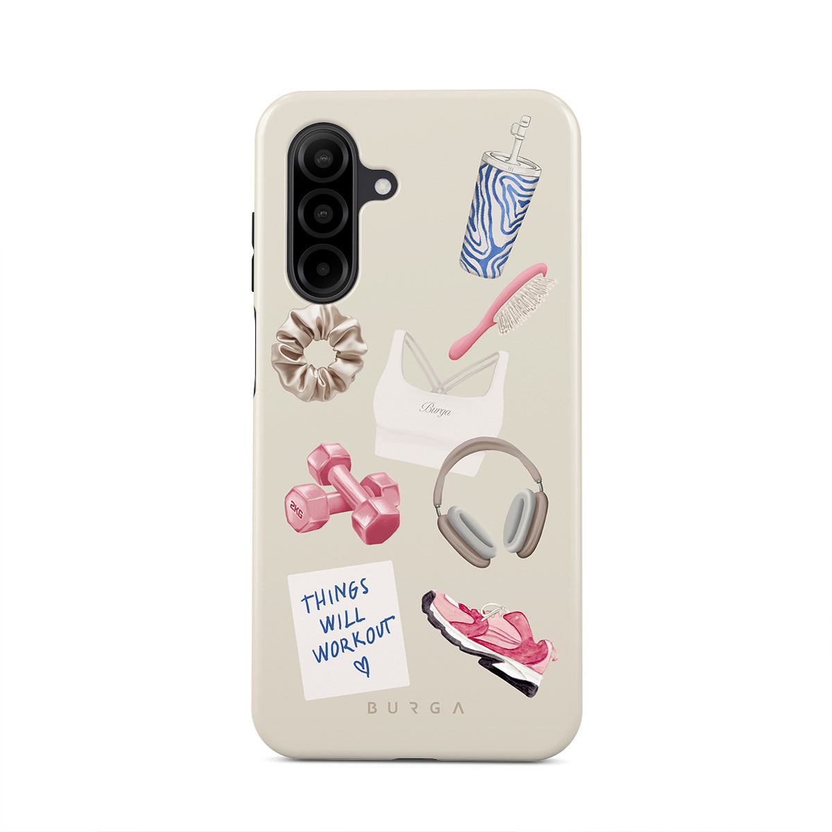 This design features: dumbbells, headphones, tumbler, hairbrush, pink trainers, sports bra, crunchie, "Things Will Work Out" sticky note