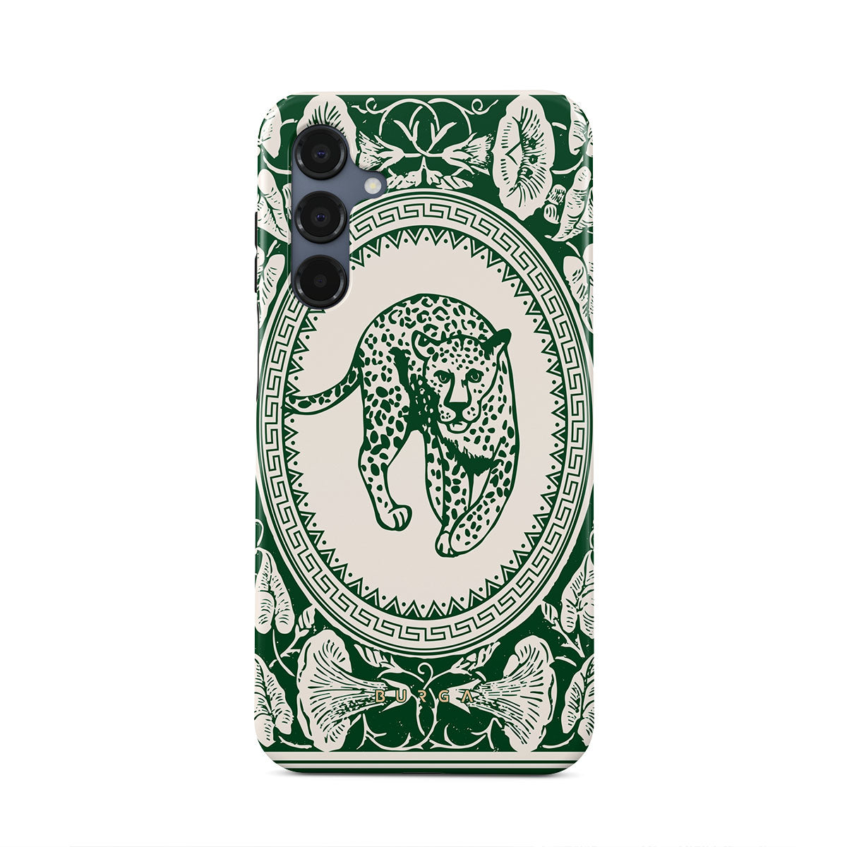 Our Antique Samsung Galaxy A16 phone case designa nude canvas kissed by refined green contours, painting an eternal saga of elegance. Enthroned at its center is a regal leopard embraced by a tender floral caress. A nod to timeless opulence, this design captures the essence of vintage prestige.