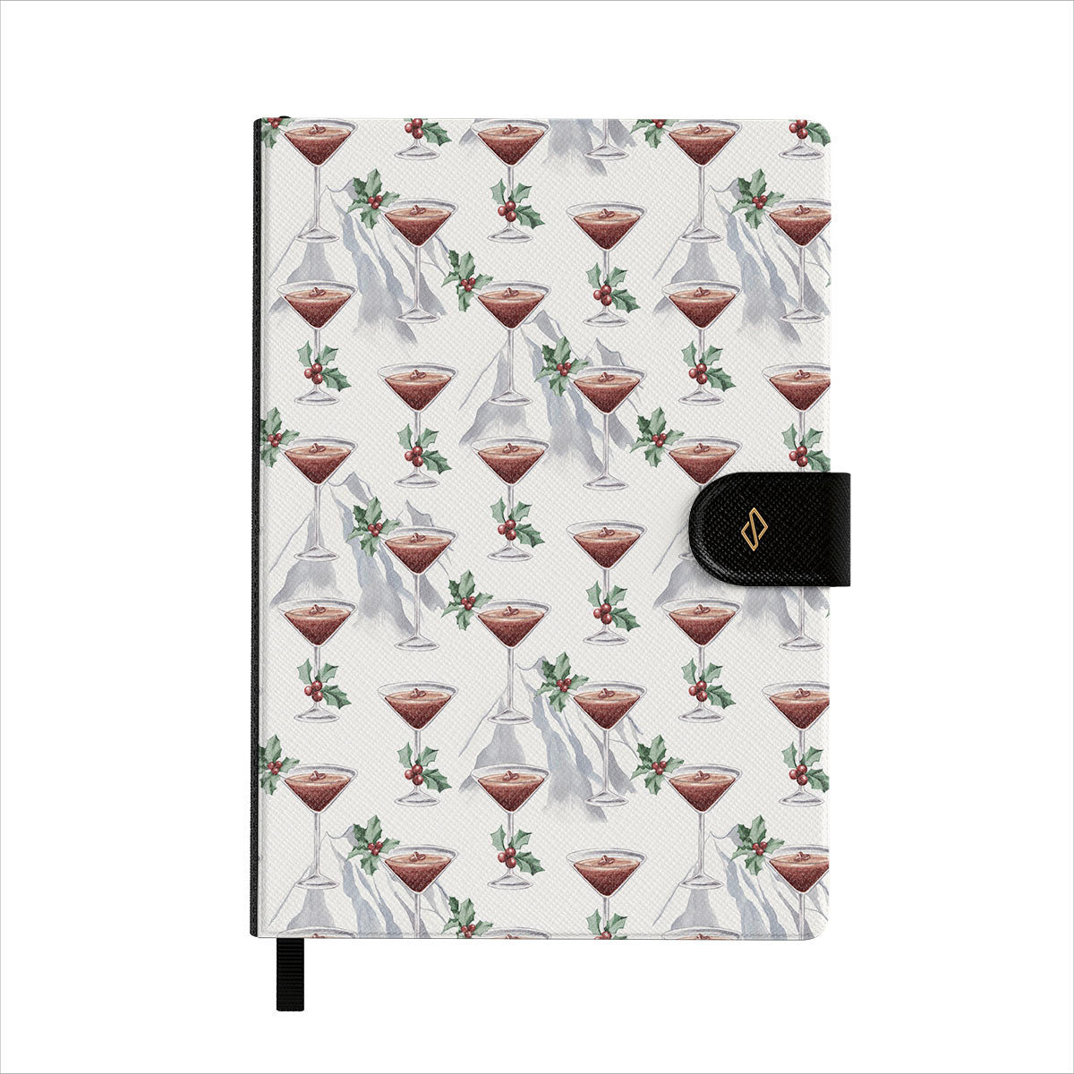 This design features: cocktail glasses, martinis, holly leaves