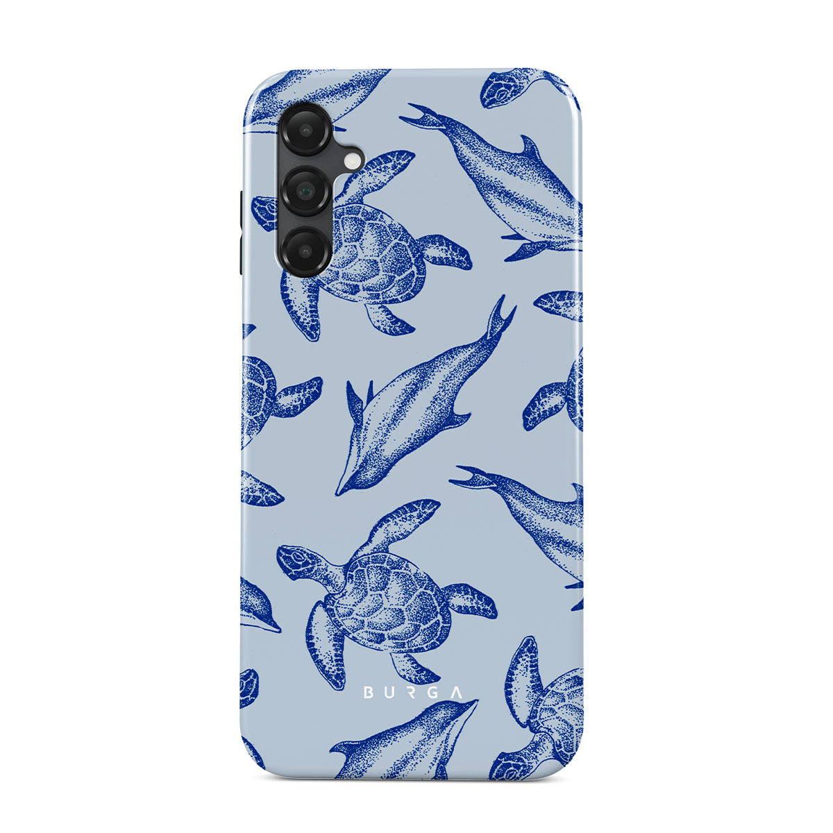 A beautiful design featuring lively turtles and dolphins playfully dancing in serene light blue water. Dive into the ocean's rhythm with our Aquatic Dance Samsung Galaxy A14 5G case.