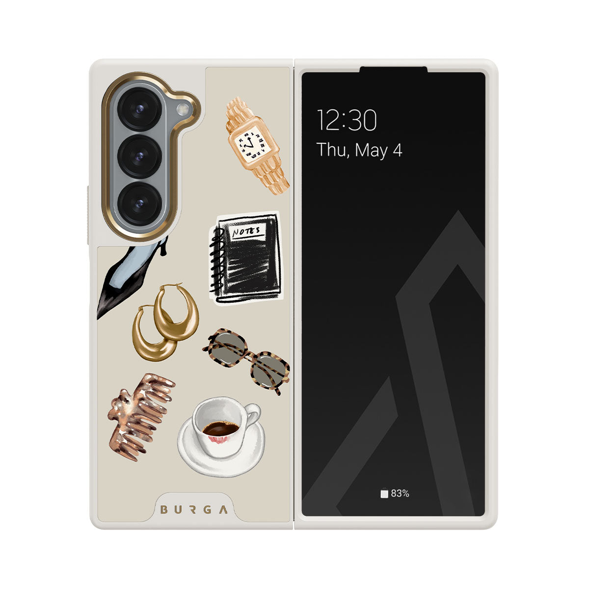 This design features: black high heel, gold hoop earrings, black notebook, coffee cup, tortoiseshell glasses, brown scrunchie, retro gold watch