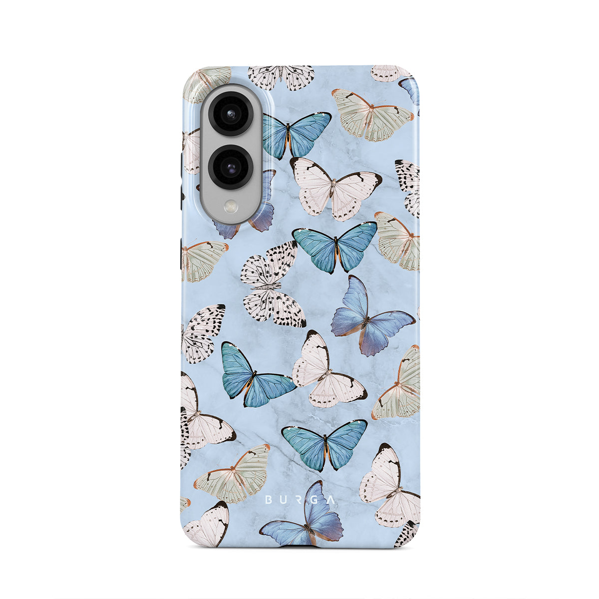 Pastel blue and a playful pattern of summery butterflies create a dreamy combination in our Samsung Galaxy S25 Edge phone case. Carry the feeling of the butterflies in your stomach while protecting your phone from any dangers, as the hard-shell case will keep it sound and safe.