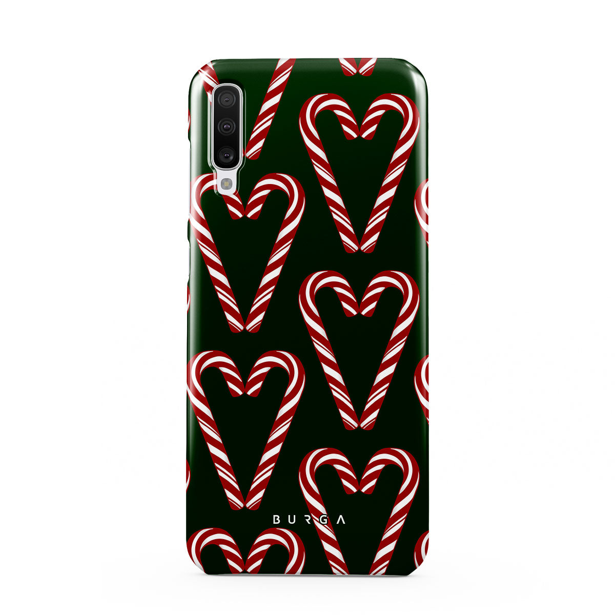 Vibrant and playful, our Candy Cane Samsung Galaxy A70 Case phone case design showcases candy cane heart motifs against a dark green background—a delightful choice for those who love a touch of whimsy and nostalgia.