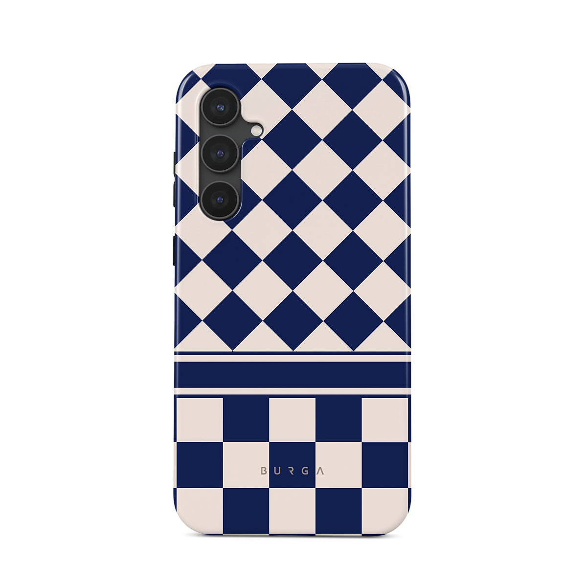 Embrace the essence of subtle luxury with our Check & Mate Samsung Galaxy S23 FE phone case design. Blending eggshell and deep blue checkers, it evokes whispers of elegance. While diamonds grace the upper half, the lower half features a timeless chessboard pattern.
