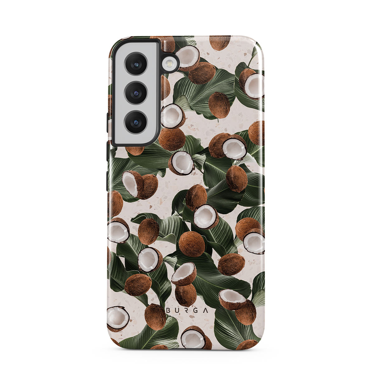 Coconut Crush Samsung Galaxy S22 Plus phone case showcases a soft creme color design with a playful addition of coconuts on top. The unexpected design duo will add a touch of tropical playfulness to your style while offering heavy-duty protection for your cell phone.