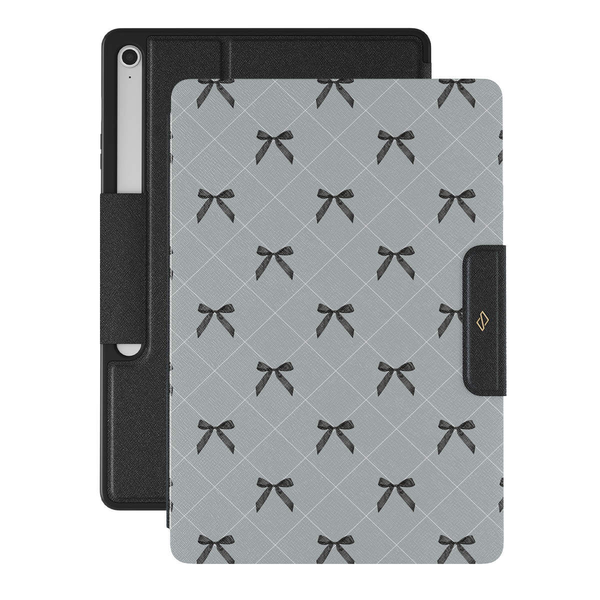 A subtle hint to a world of dance and soft melodies. Crisscrossing bows over a muted gray tone capture the flirtatious essence of the coquette-core aesthetic. Playful and sweet, our Coquette Samsung Galaxy Tab S10+ FE folio case design is perfect for those who find beauty in the details.