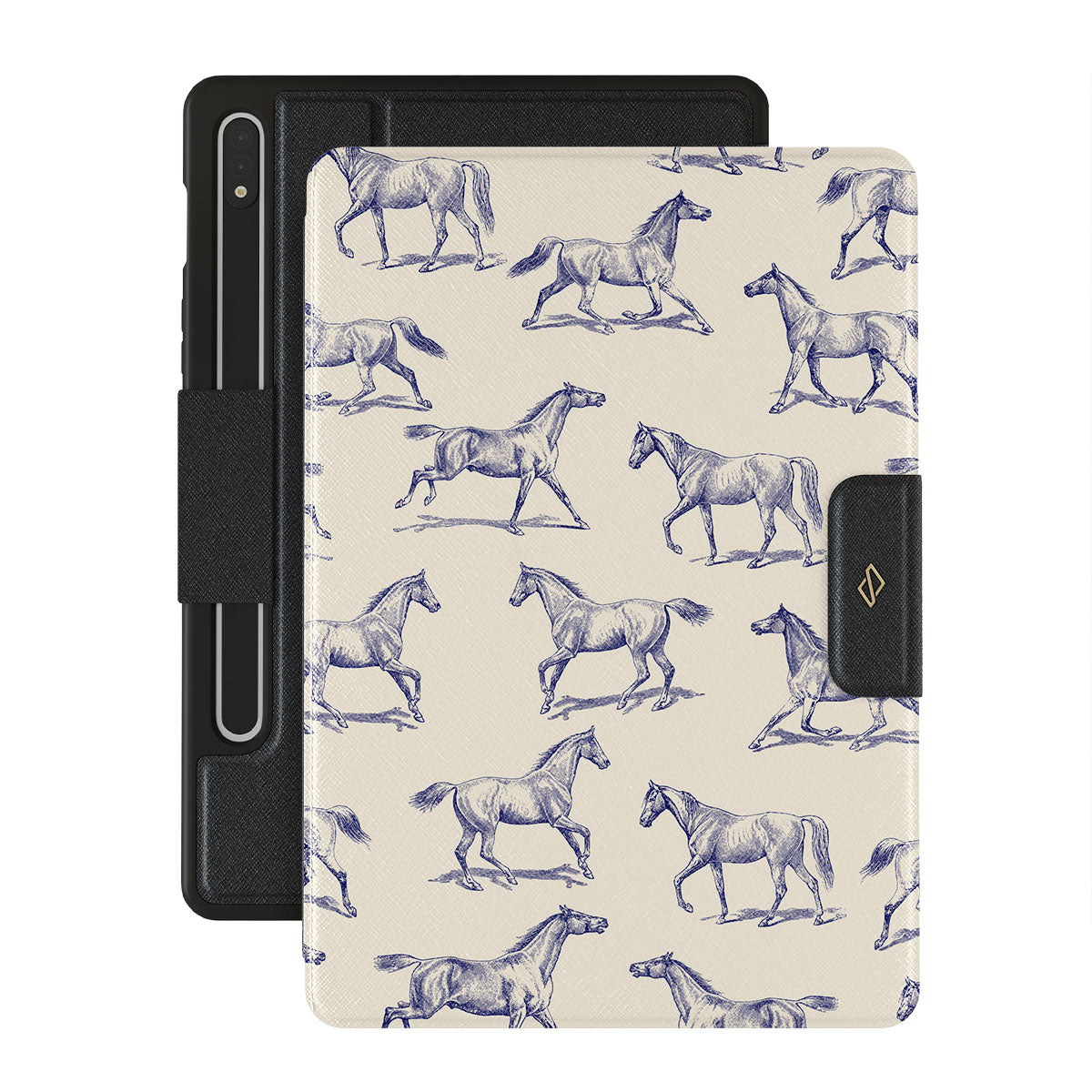 Introducing our Derby Race Samsung Galaxy Tab S9 FE folio case design—a portrait of elegance in motion on a soft nude canvas. Engraved in delicate blue contours, galloping horses dance upon the wind, frozen in an exquisite moment of grace.
