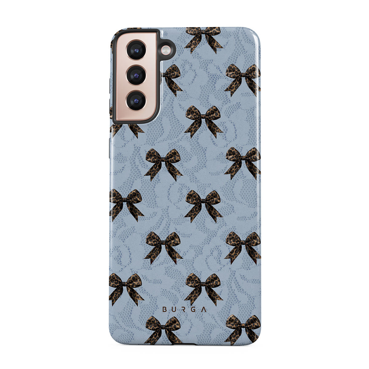 For those who command attention with subtle elegance, our Fashionista Samsung Galaxy S21 Plus phone case design is your go-to. A soft blue background, accented by dark grey bows and subtle lace patterns, exudes polished, effortless style. It's quiet confidence with a hint of charm.