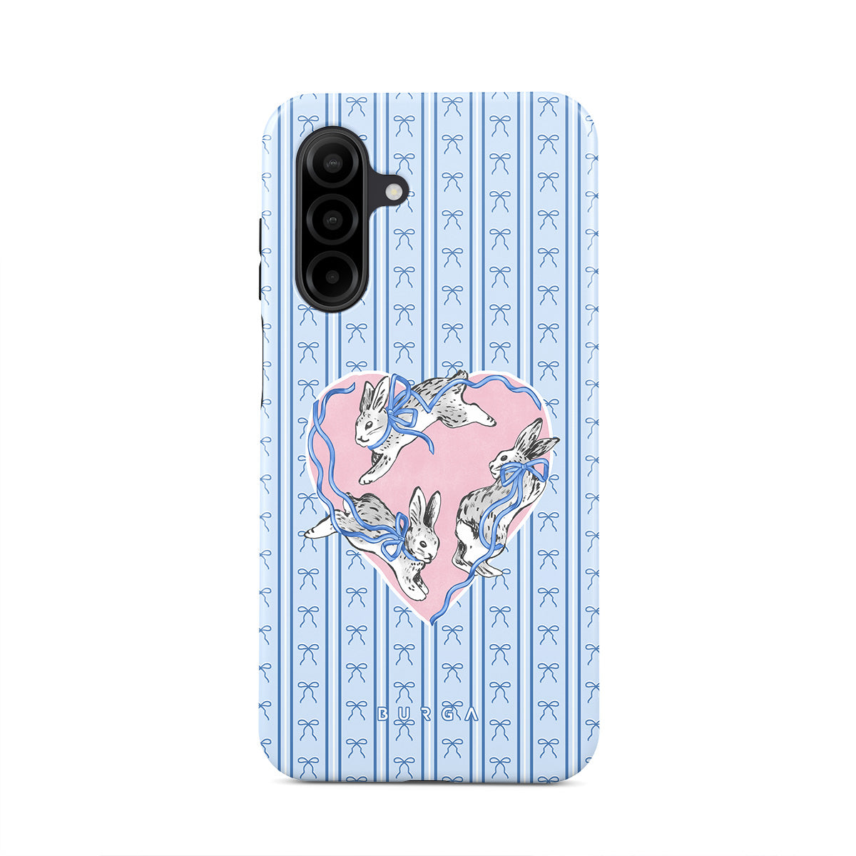 This design features: white rabbits, heart frame, blue stripes