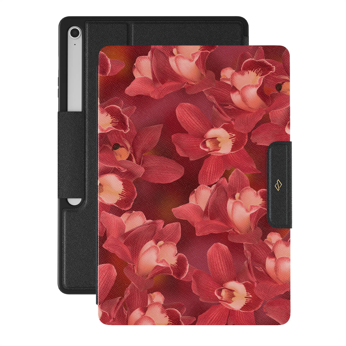 The deep red orchids emerge with a passionate intensity, evoking the fervor and depth of emotions that come with fully experiencing life. They are a vibrant call to embrace every heartbeat, to live deeply and love boldly. Discover the Goddess Energy Samsung Galaxy Tab S10+ FE folio case design.