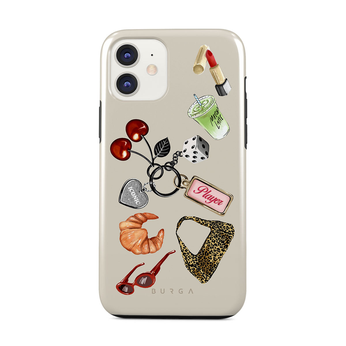 This design features: red sunglasses, red lipstick, green matcha drink, croissant, black dice, leopard-print bag, keychain with silver heart, cherries, dice and "Player" tag