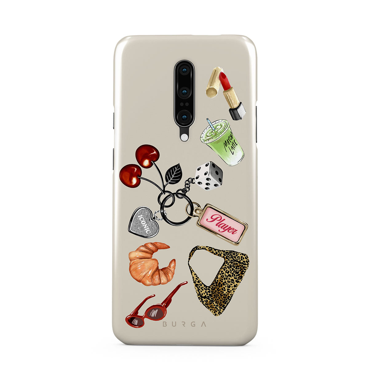 This design features: red sunglasses, red lipstick, green matcha drink, croissant, black dice, leopard-print bag, keychain with silver heart, cherries, dice and "Player" tag