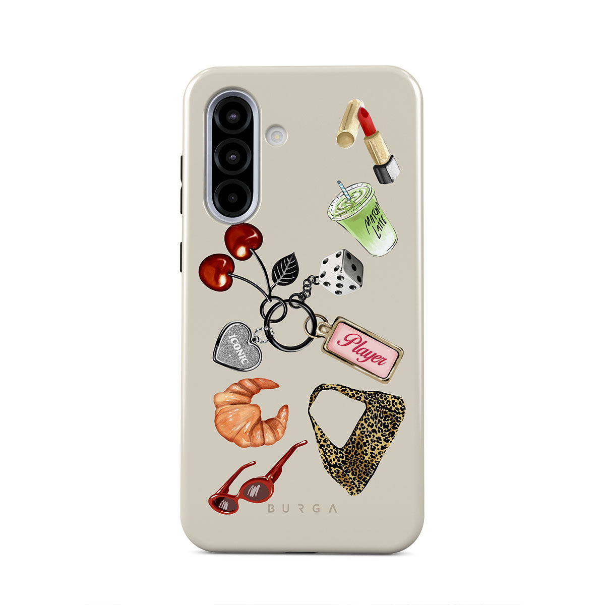 This design features: red sunglasses, red lipstick, green matcha drink, croissant, black dice, leopard-print bag, keychain with silver heart, cherries, dice and "Player" tag
