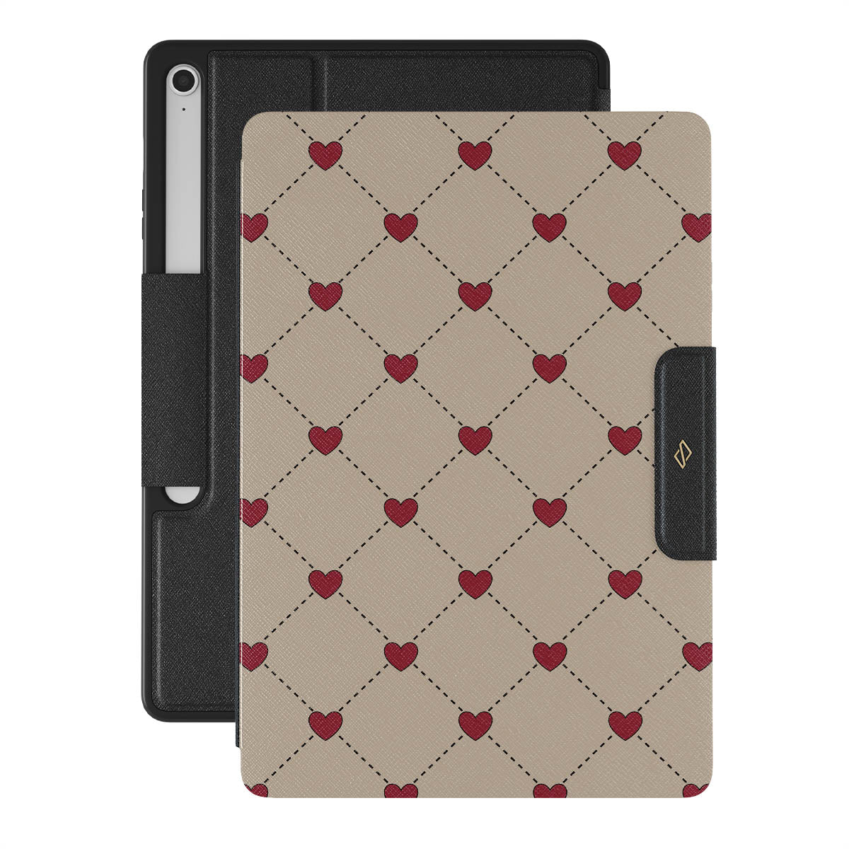 Secrets of the heart whispered between elegant beige diamonds. Every moment, a red heart shimmers—a hidden message, a silent wish, a love letter to the beholder. Discover our Love Letter Samsung Galaxy Tab S10+ FE folio case design.