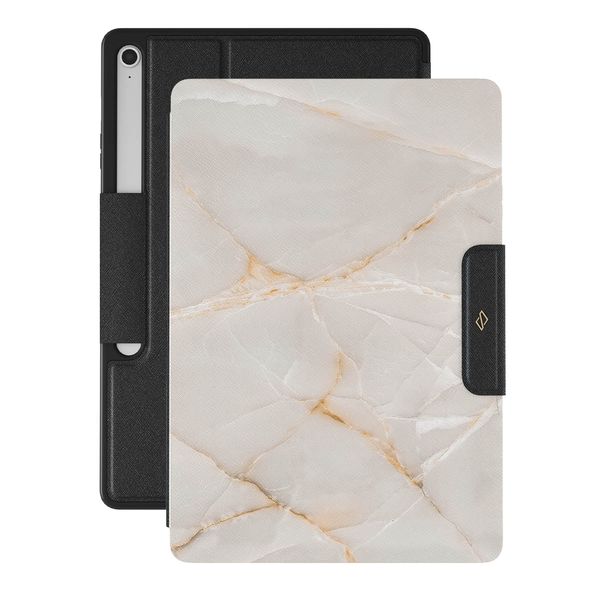 The Vanilla Sand Marble Samsung Galaxy Tab S10+ FE folio case cover features a marble design with creamy canvas showcasing beautiful golden hues. The soft-toned case will add a touch of luxury to the device while protecting it from dangerous falls.