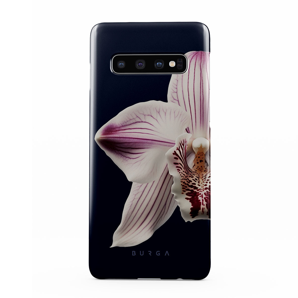 The white orchid blooms boldly upon a night sky blue, a beacon of clarity in the darkness. Our Nectar Samsung Galaxy S10 Plus phone case design speaks to the soul's desire to find light within, to illuminate the hidden paths of self-discovery that only reveal themselves under the cloak of introspection.