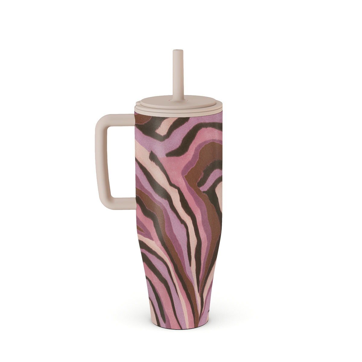 This design features: zebra stripes, pink and brown, animal print
