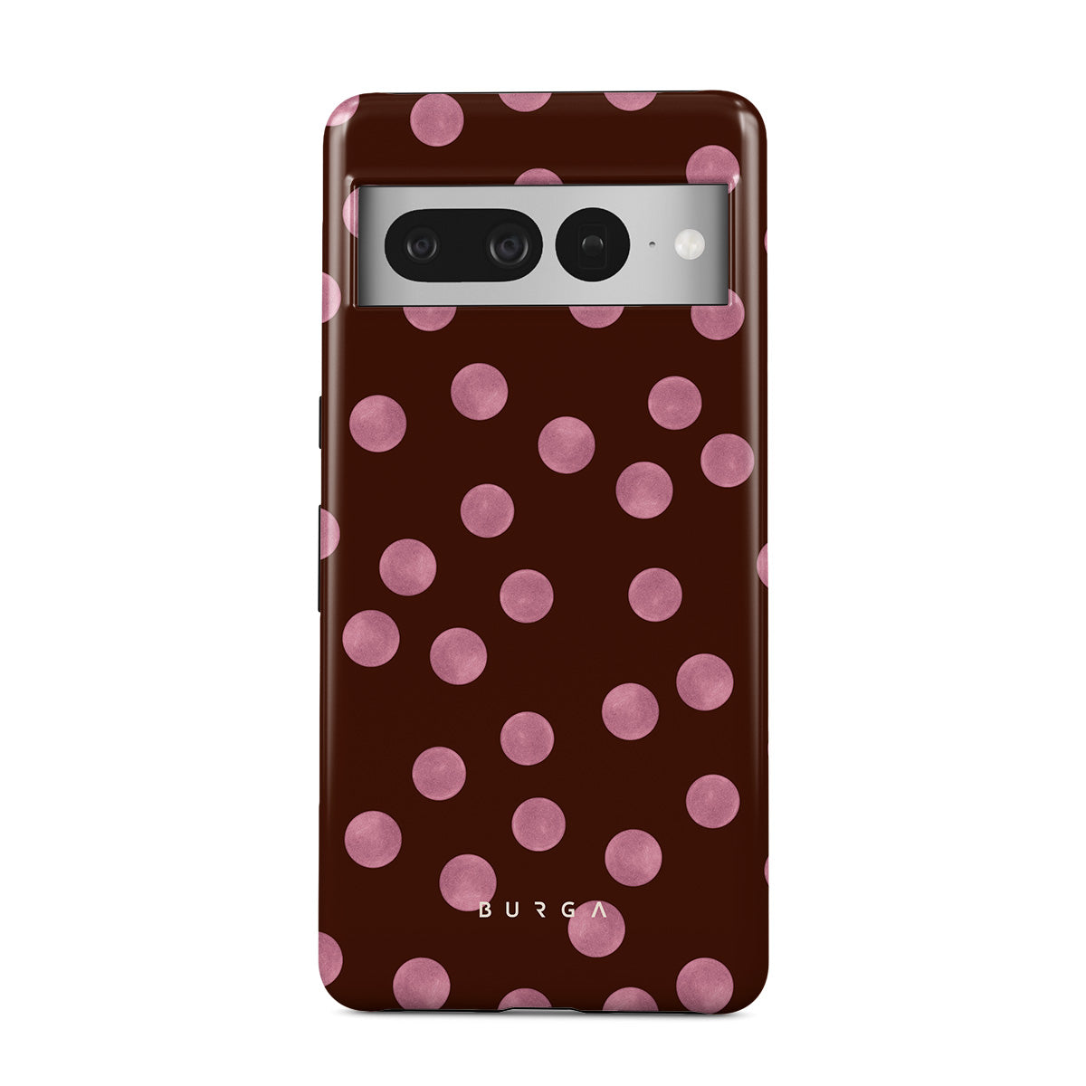 This design features: pink polka dots, brown background, dotted pattern