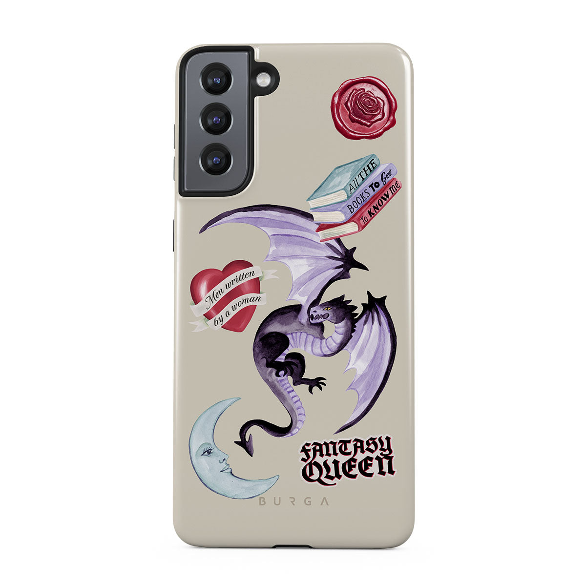 This design features: purple dragon, "Fantasy Queen" sticker, crescent moon, purple wax seal, heart with message, books