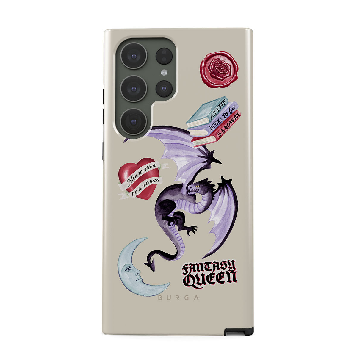 This design features: purple dragon, "Fantasy Queen" sticker, crescent moon, purple wax seal, heart with message, books