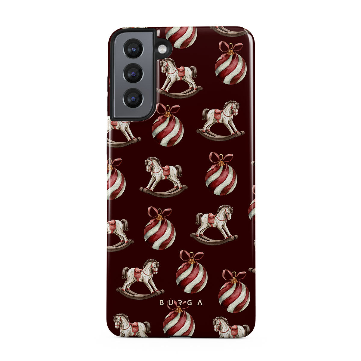 Jingle all the way with this playful Samsung Galaxy S21 phone case design. Featuring rocking horses and candy-striped bells, our Rocking Around design transports you back to childhood moments of decorating the tree and waiting for Santa. It’s the ultimate throwback to vintage Christmas charm.