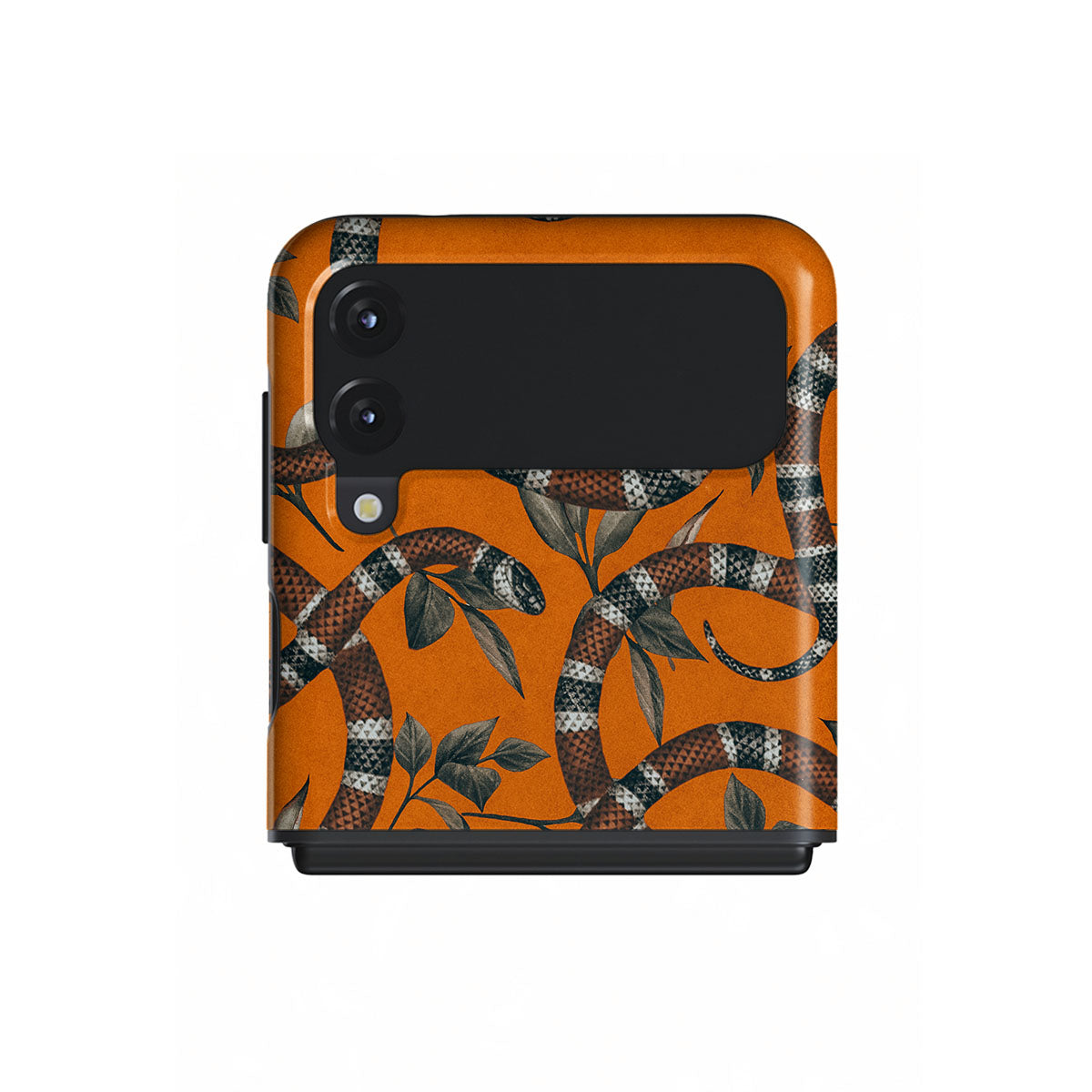 Take a bit of fierceness with yourself with our bright orange and dangerously beautiful Samsung Galaxy Z Flip 3 phone case with a snake pattern. This case is real eye candy for fashion lovers and just as needed for those who strive to keep their phones protected.