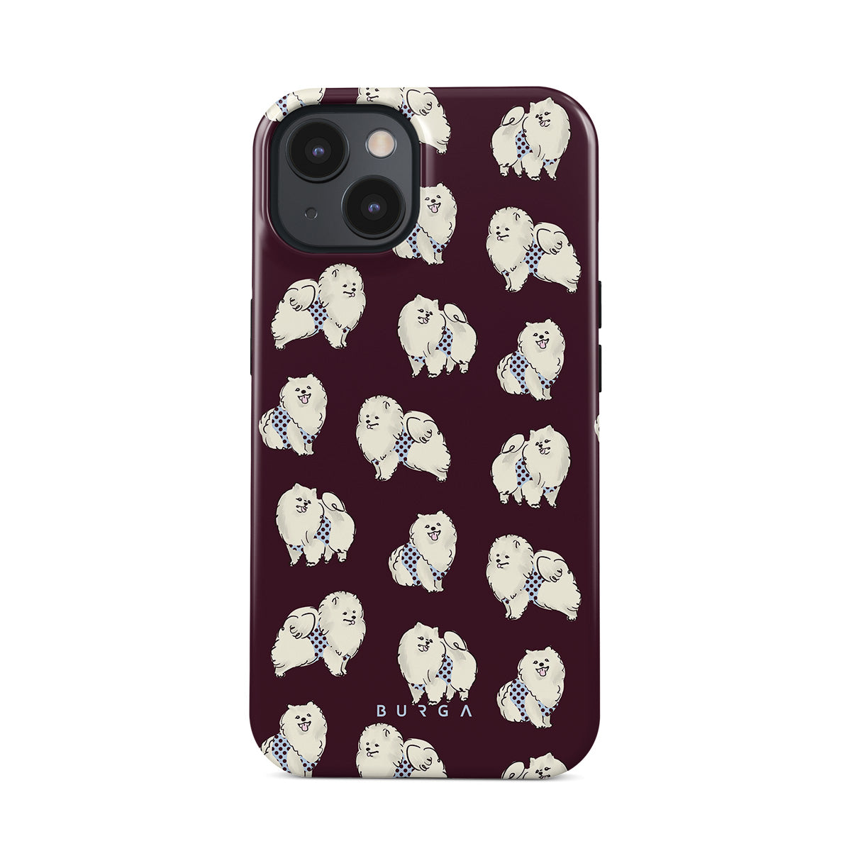This design features: white fluffy dogs on a deep burgundy background, poodles, pets.