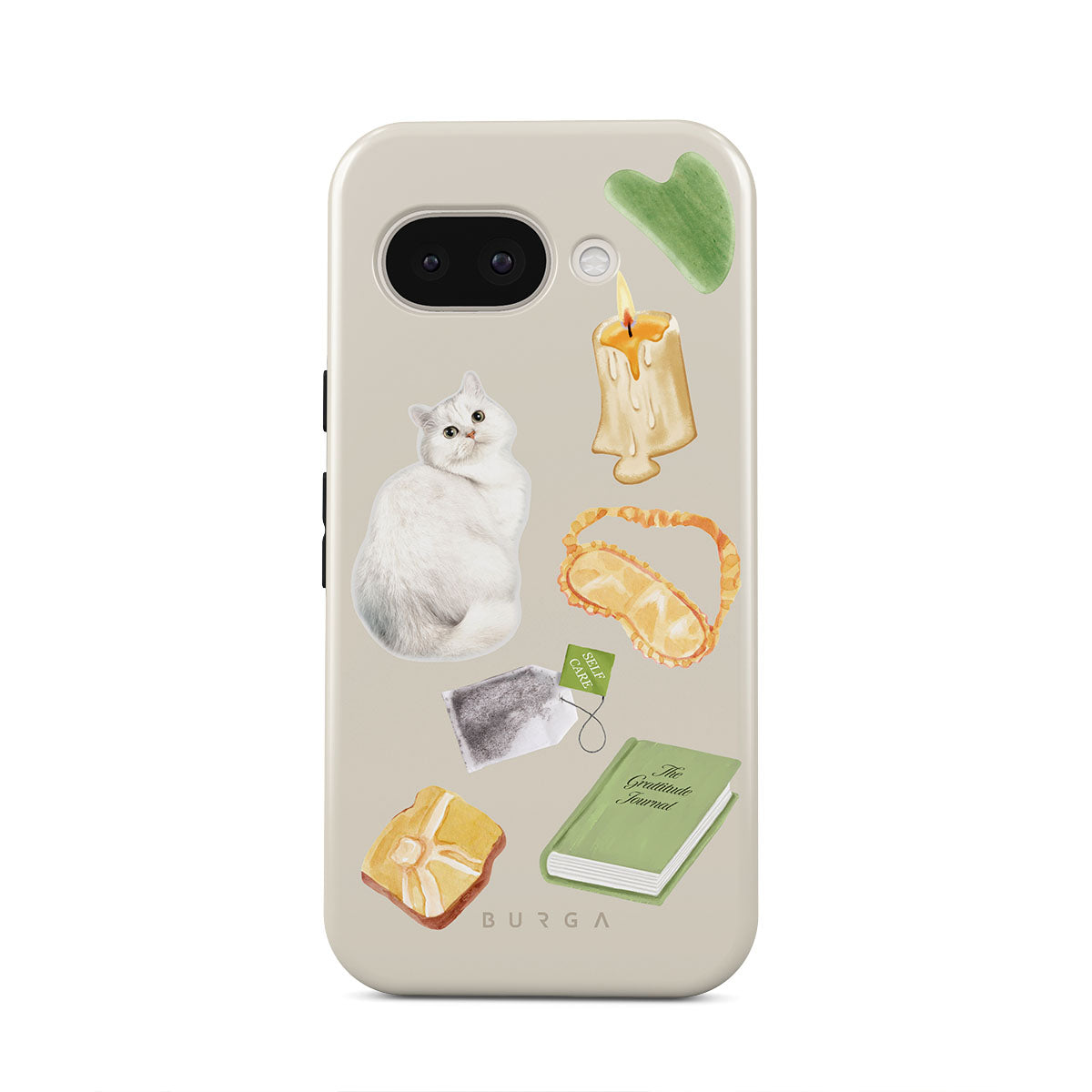 This design features: white cat, green book, candle, Gua Sha bar, sleeping mask, tea bag, yellow crystal