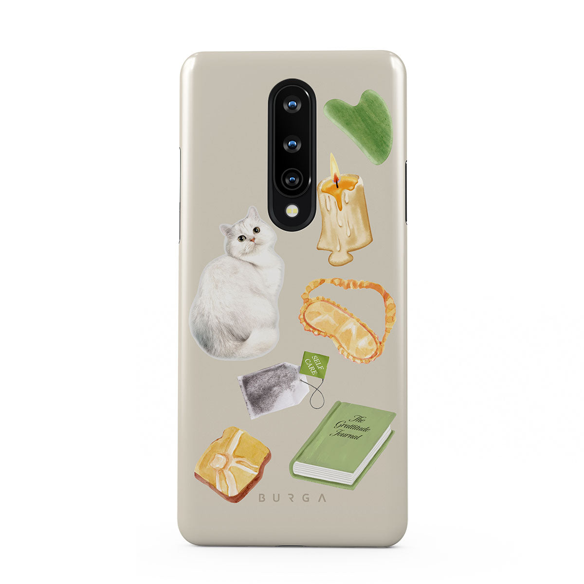 This design features: white cat, green book, candle, Gua Sha bar, sleeping mask, tea bag, yellow crystal