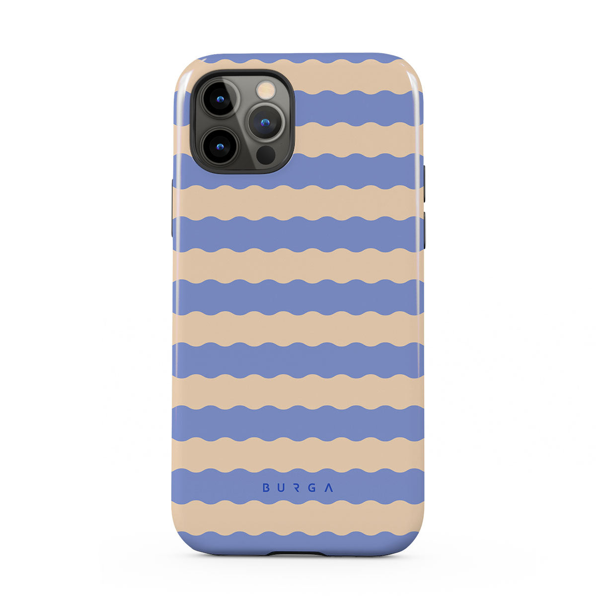 Dive into the cool, refreshing style of our Splash design–a dynamic iPhone 12 Pro phone case featuring playful, wavy stripes of serene ocean blue and soft sandy beige. Perfect for those who love to make a splash with their accessories.