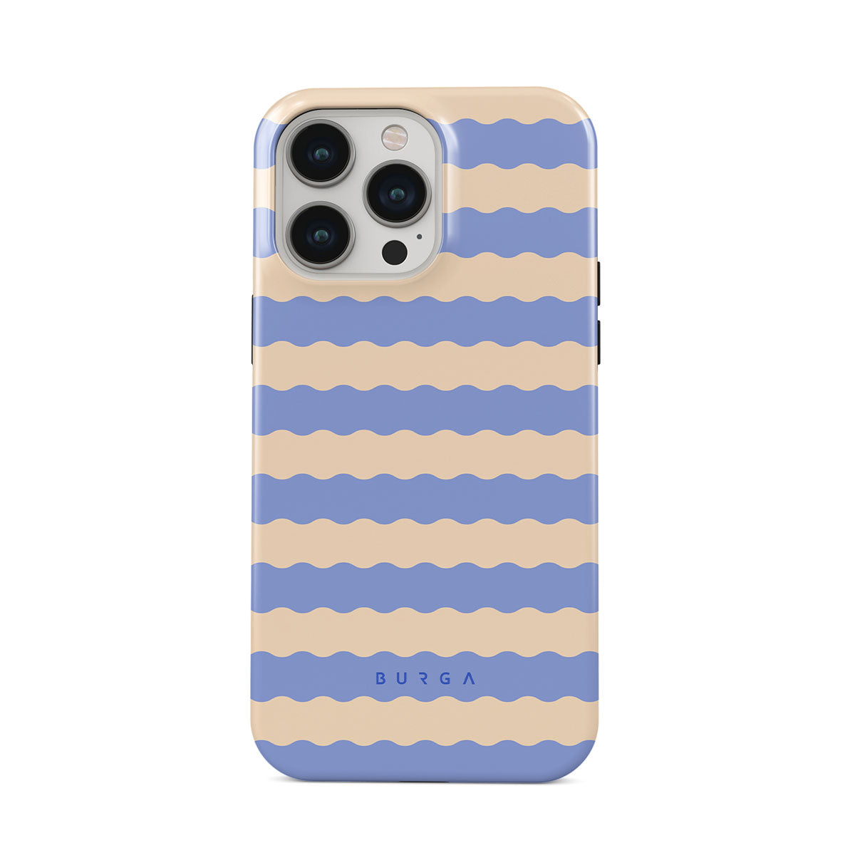 Dive into the cool, refreshing style of our Splash design–a dynamic iPhone 13 Pro phone case featuring playful, wavy stripes of serene ocean blue and soft sandy beige. Perfect for those who love to make a splash with their accessories.