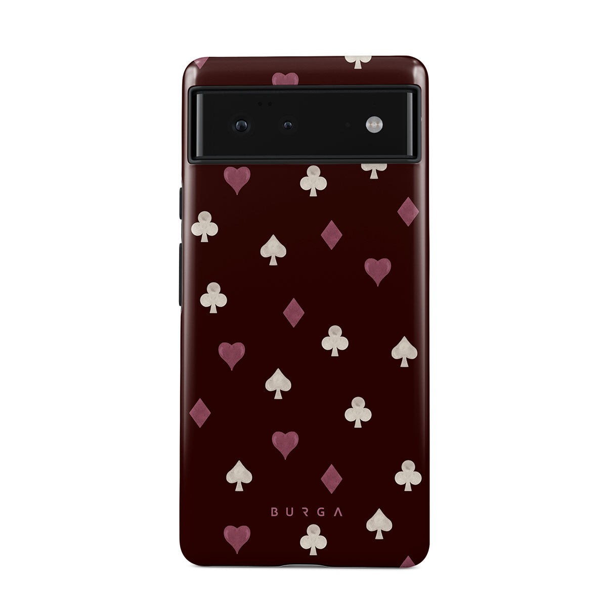 Nothing is as it appears. Hearts, clubs, diamonds, and spades—stacked in your favor or playing against you? This Google Pixel 6 phone case design features a rich burgundy background and minimalist suits that make for a game where the rules are constantly shifting.