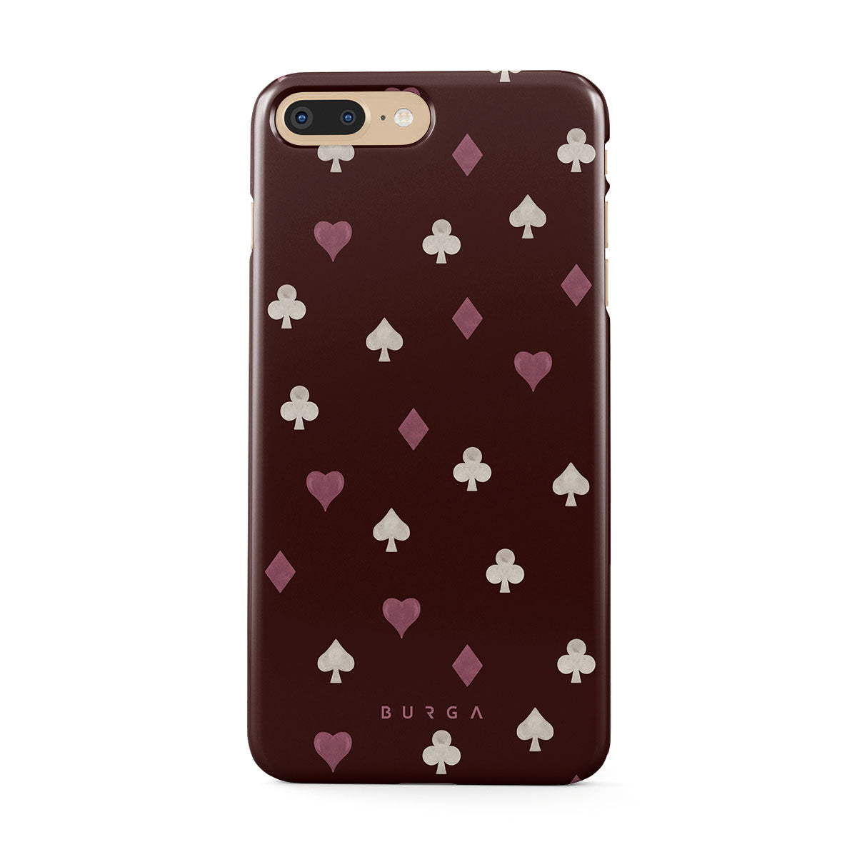 Nothing is as it appears. Hearts, clubs, diamonds, and spades—stacked in your favor or playing against you? This iPhone 7 Plus / 8 Plus phone case design features a rich burgundy background and minimalist suits that make for a game where the rules are constantly shifting.