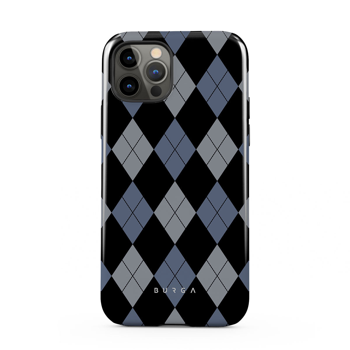 Discover our Trouble iPhone 12 Pro phone case design—a classic argyle pattern featuring stark black diamonds that seamlessly blend with two distinct shades of blue. Made for those who respect the classics but aren't afraid to disrupt the norm.