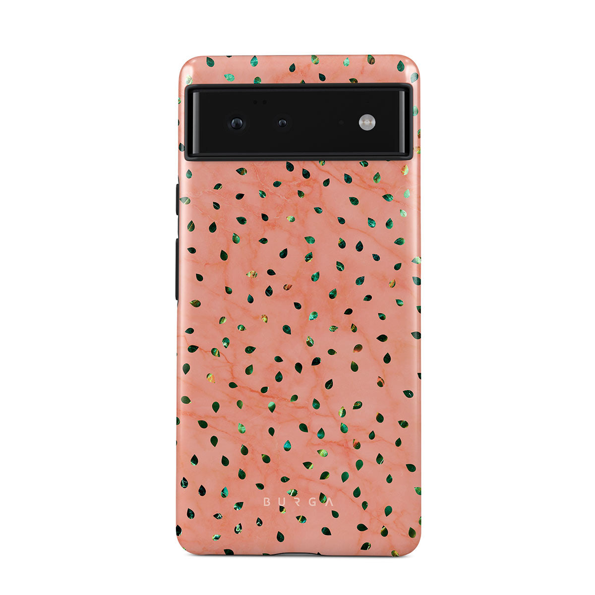 The Watermelon Shake Google Pixel 6 phone case offers a playful take on design merging. The watermelon seed-like specks showcase striking tropical design fragments that add a splash of color to the fresh and breezy coral pink marble. This way, the funny protective phone cover becomes a perfect statement piece for your summer outfits.