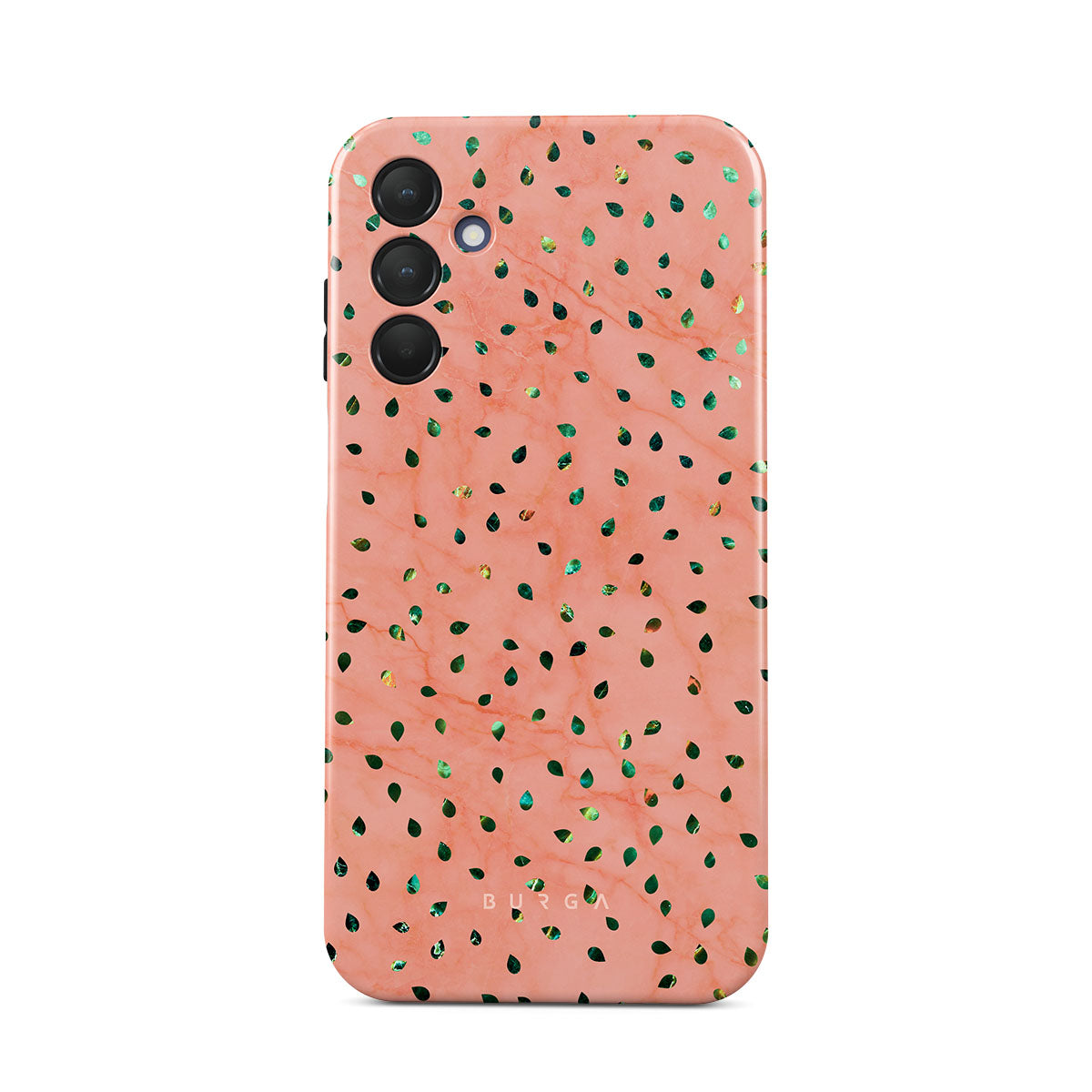 The Watermelon Shake Samsung Galaxy A51 phone case offers a playful take on design merging. The watermelon seed-like specks showcase striking tropical design fragments that add a splash of color to the fresh and breezy coral pink marble. This way, the funny protective phone cover becomes a perfect statement piece for your summer outfits.
